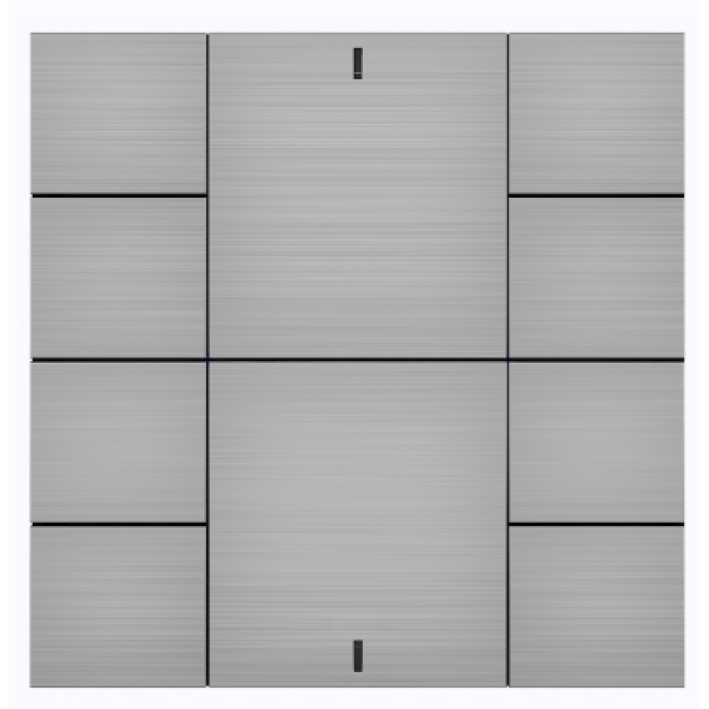 Настенный интеллектуальный выключатель‑контроллер с десятью клавишами, встроенными датчиками температуры, влажности и освещённости, LED‑индикацией, двумя универсальными входами и встроенным BCU для интеграции в «умный дом». Лицевая панель — алюминий натуральный шлифованный.