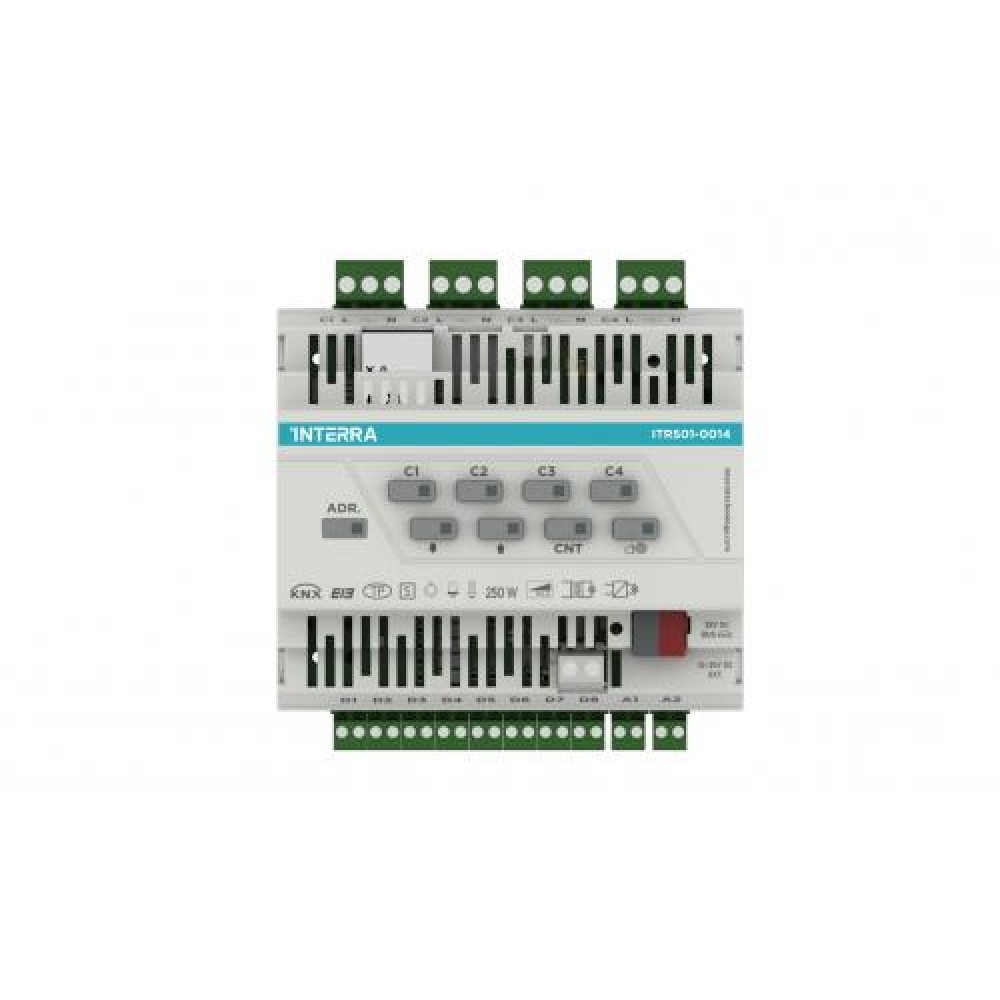 Interra ITR501-0014 Универсальный диммер KNX 4 канала 250/200 Вт на канал 8 цифровых и 2 аналоговых входа защита от перегрева и КЗ ручное управление DIN‑рейка