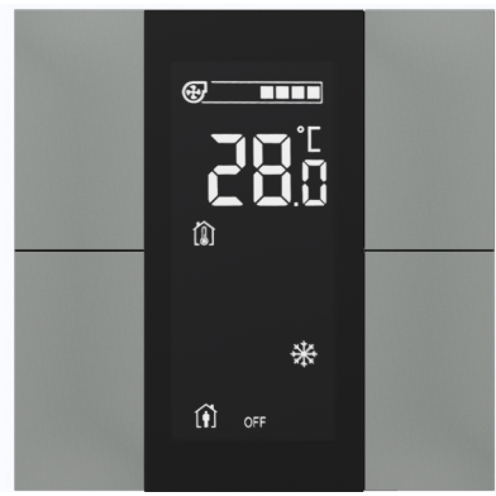 • Выключатель / комнатный контроллер с ЖК-дисплеем iSwitch+ 4-кнопочный, встроенные датчики температуры, влажности, освещенности, LED индикация, 2 унив. входа, с BCU, материал пластик, цвет серый металлик