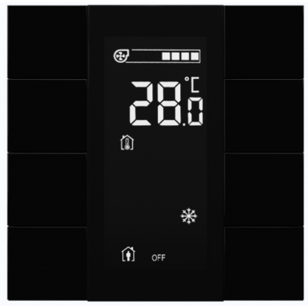 Настенный выключатель‑контроллер с 8 сенсорными клавишами и встроенным ЖК‑дисплеем. Оснащён датчиками температуры, влажности и освещённости, LED‑индикацией, двумя универсальными входами и BCU для интеграции в систему «умный дом». Корпус пластик, цвет угольно‑чёрный глянцевый.
