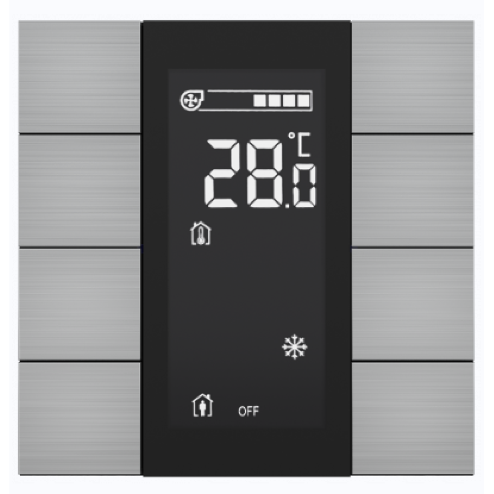 Настенный интеллектуальный выключатель‑контроллер с восемью клавишами, встроенными датчиками температуры, влажности и освещённости, LED‑индикацией, двумя универсальными входами и встроенным BCU для интеграции в систему «умный дом». Лицевая панель выполнена из натурального шлифованного алюминия. ЖК‑дисплей отображает состояние каналов, текущие значения датчиков и меню управления.