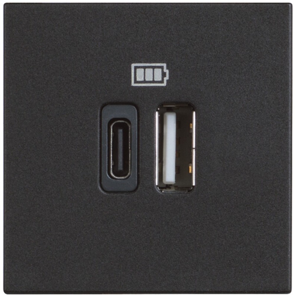Технические характеристики Розетка зарядное устройство USB 2 разъёма тип - C/тип - A 3000мА - 2 модуля. Цвет Чёрный. Bticino серия CLASSIA. RG4287C2