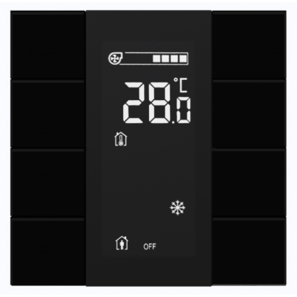 • Выключатель / комнатный контроллер с ЖК-дисплеем iSwitch+ 8-кнопочный, встроенные датчики температуры, влажности, освещенности, LED индикация, 2 унив. входа, с BCU, материал плексигласс, цвет черный