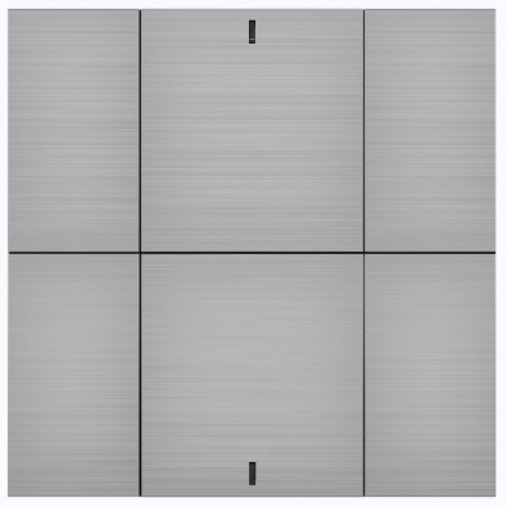 Настенный интеллектуальный выключатель‑контроллер с шестью клавишами, встроенными датчиками температуры, влажности и освещённости, LED‑индикацией, двумя универсальными входами и встроенным BCU для интеграции в систему «умный дом». Лицевая панель — алюминий натуральный шлифованный.