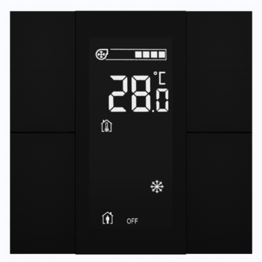 Настенный выключатель и комнатный контроллер Interra iSwitch+ в 4‑кнопочном исполнении с ЖК‑дисплеем для отображения состояния и настроек. Встроенные датчики температуры, влажности и освещенности, LED‑индикация, два универсальных входа и поддержка BCU для гибкой логики и интеграции. Корпус из анодированного алюминия с черной шлифованной отделкой.