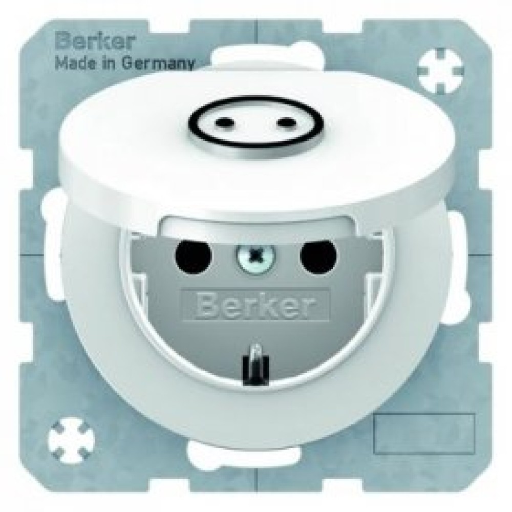 • 47442079 Штепсельная розетка SCHUKO с откидной крышкой и выступающим символом "Розетка" , полярная белизна, с блеском, с защитой от детей VDE 0620-1 R.1/R.3 Berker