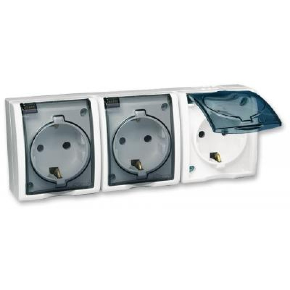 • 1594447-030 Розетка тройная с заземлением Schuko со шторками, с крышкой полупрозрачной, IP54, 16А 250В, винтовой Simon 15 Aqua